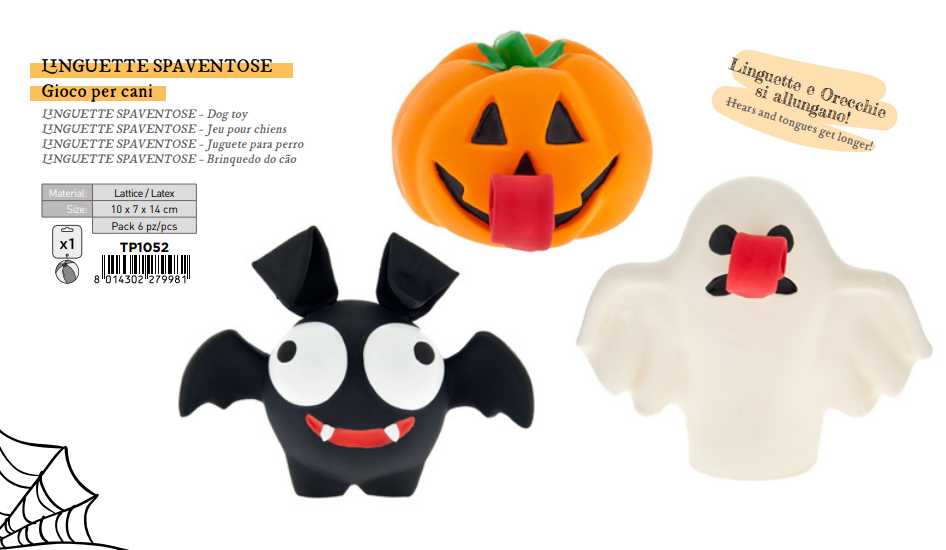 Prepara il tuo amico peloso a un Halloween da brividi (e risate) con Linguette Spaventose, il gioco in lattice sicuro e flessibile che farà impazzire di gioia il tuo cane! Con le sue lingue e orecchie che si allungano, ogni morso diventa una sorpresa mostruosa!